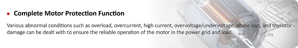 حماية فقدان الطور ، حماية التيار الزائد ، حماية الحمل الزائد ، حماية الخلل الحالي ، حماية ح درجة الحرارة ، حماية مهلة البدء ، حماية الجهد/الجهد الزائد ، البدء في حماية التردد ، حماية التيار العالي ، حماية انهيار الثايرستور ، حماية السلطة العكسية ، حماية أخطاء الأسلاك ، إلخ. |